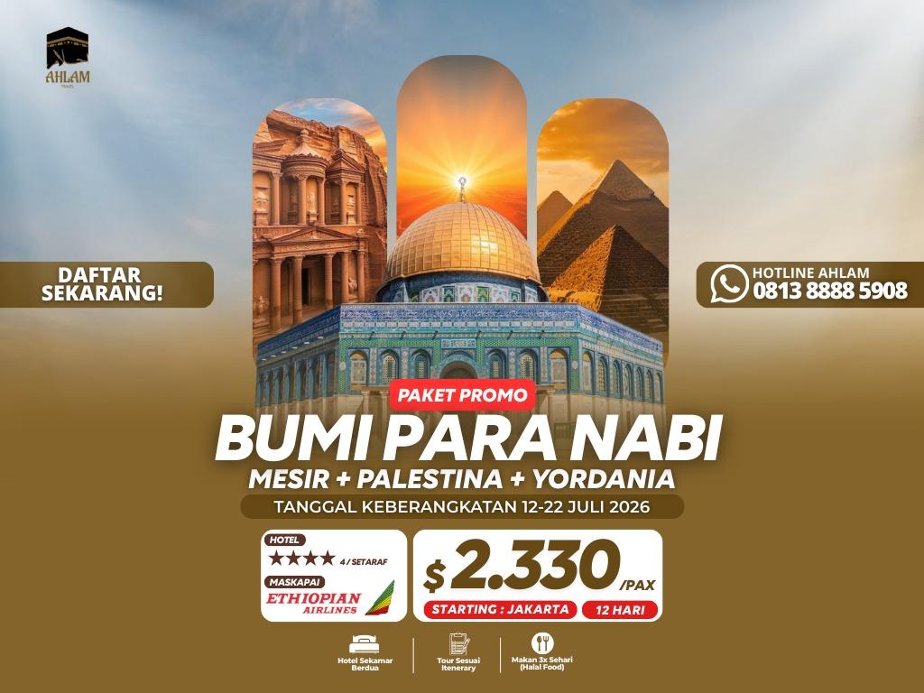 Jelajahi jejak sejarah dan spiritual ke Mesir, Palestina, dan Yordania dalam perjalanan istimewa 12 hari yang penuh makna.